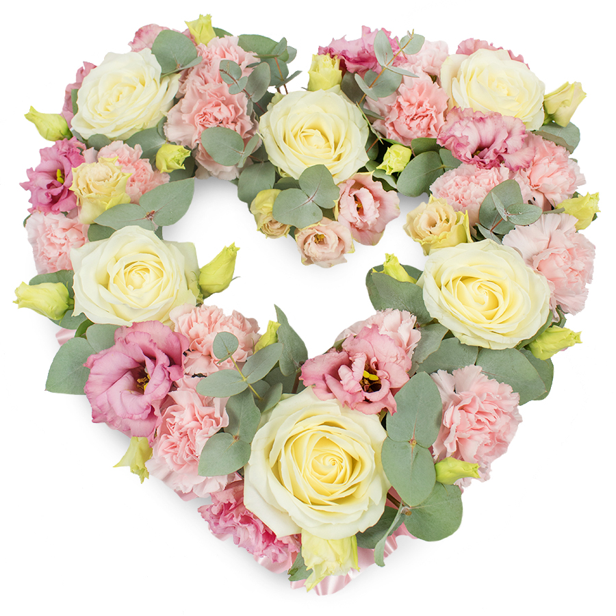 Express your sincere sentiments with our lovely open heart tribute bouquet. This charming arrangement features a delightful combination of white roses, elegant pink carnations, delicate pink lisianthus, and aromatic eucalyptus leaves, all hand-selected to ensure top-notch freshness and beauty.
